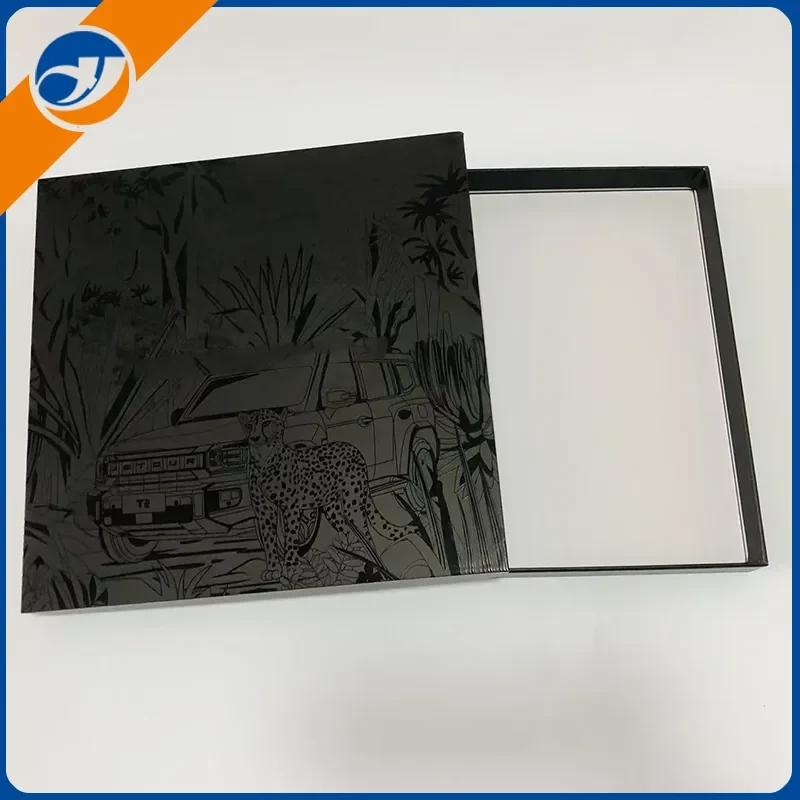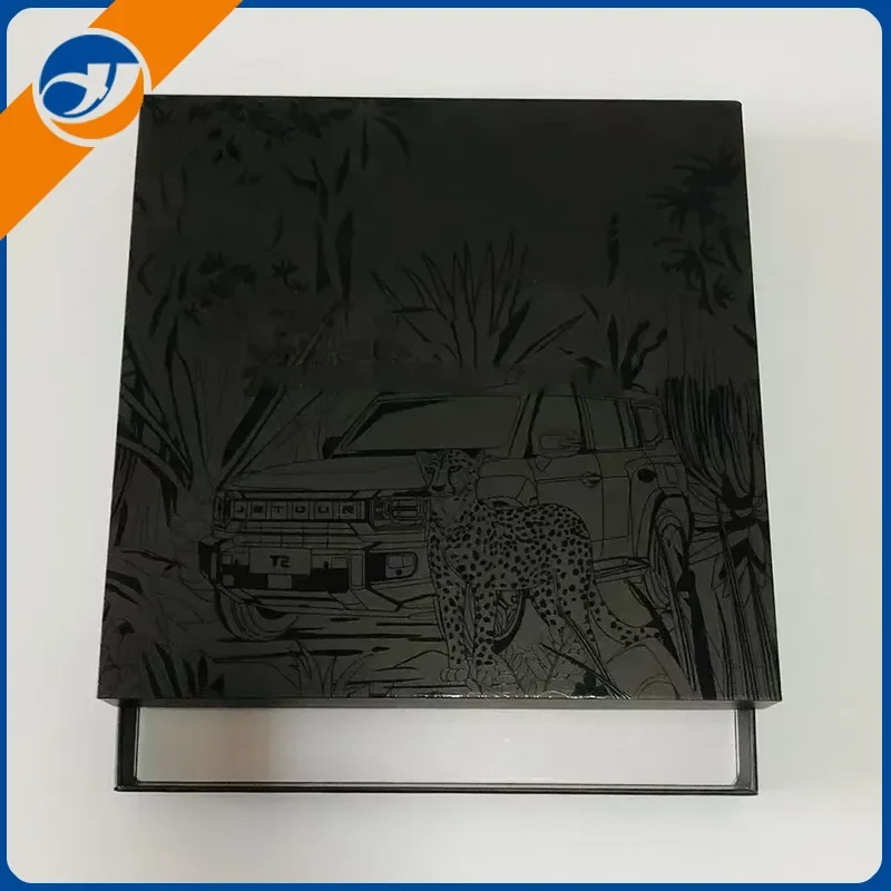 Juoda matinė reljefinė dovanų dėžutė yra pagaminta iš specialaus popieriaus ir medienos plaušų plokštės, todėl yra subtilus prisilietimas ir yra atsparus dilimui ir įbrėžimams. Jo paviršius atsparus pirštų atspaudams, išryškindamas aukščiausios kokybės tekstūrą. Dangtelyje yra 3D įspaudas su džiunglių, leopardo ir visureigių modeliais, papildytas aukso folijos prekės ženklo logotipais. Klasikinė juodos ir auksinės spalvos spalvų schema dvelkia prabanga ir ryškiu sluoksniuotumu. Sukurta plokščioje dangaus ir žemės dangtelio struktūroje, dėžutė sklandžiai atsidaro ir užsidaro, išlaiko tvirtą formą be deformacijų ir turi plokščią vidinę erdvę, idealiai tinkančią ploniems prabangiems daiktams laikyti. Su matinio įspaudimo juodos spalvos dovanų dėžutės „tyrinėjimo“ tema, dizainas sujungia patrauklumą lauke ir rafinuotą eleganciją, efektyviai sustiprindamas prekės ženklo įvaizdį ir įsimenamumą. Be to, dovanų dėžutė palaiko visišką pritaikymą, įskaitant reljefinius raštus ir auksinės folijos tekstą, kad būtų galima lanksčiai patenkinti įvairius asmeninius pakavimo poreikius.