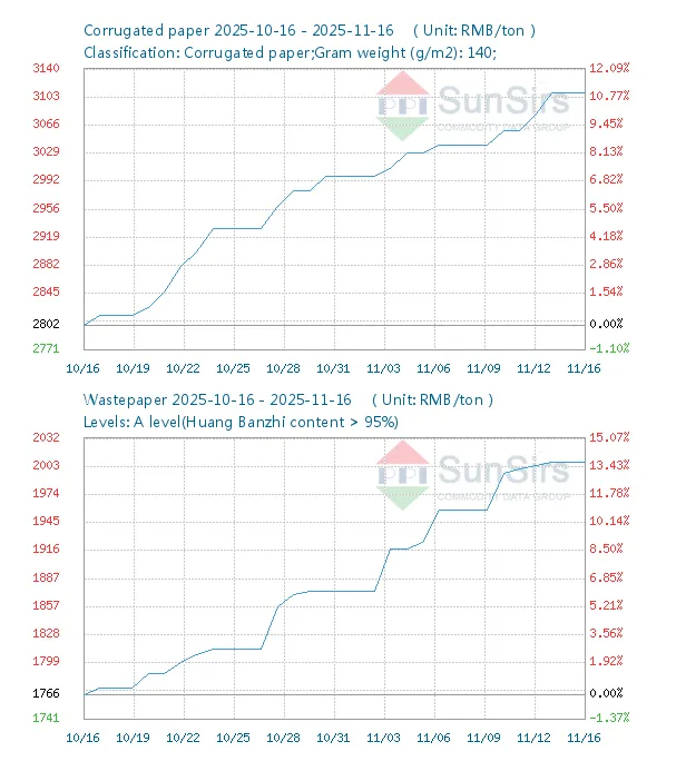 140 g/m² gofruoto popieriaus kainos nuo 2025 m. spalio 16 d. iki lapkričio 16 d. pakilo 12,09 %. Per ilgesnį laikotarpį (nuo rugpjūčio 27 d. iki lapkričio 25 d.) bendras pelnas pasiekė 20,99 %. Iki lapkričio 24 d. paskutinė kaina pasiekė 3170 RMB už toną, o nedideli koregavimai buvo tęsiami.